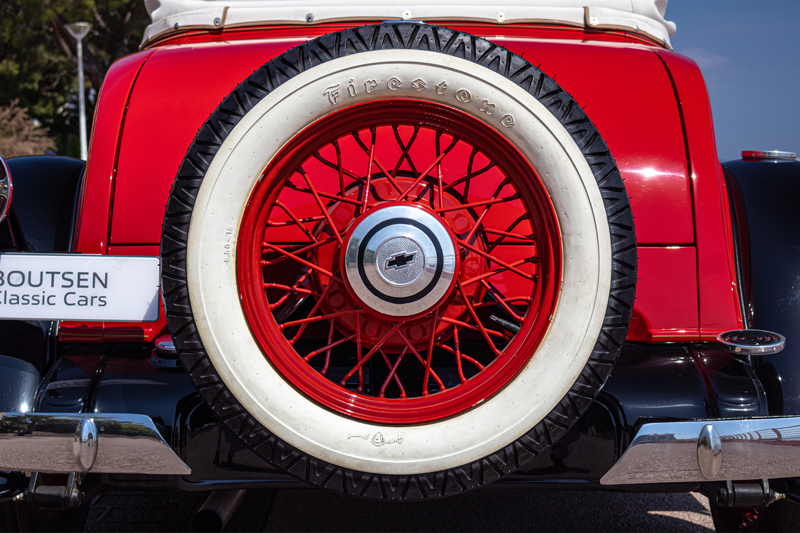The original steel rims are in perfect condition, They are equipped with white sidewall Lester Tyres 5.25 and 5.5/1b. At the rear the spare wheel is equipped with a Firestone tyre.
